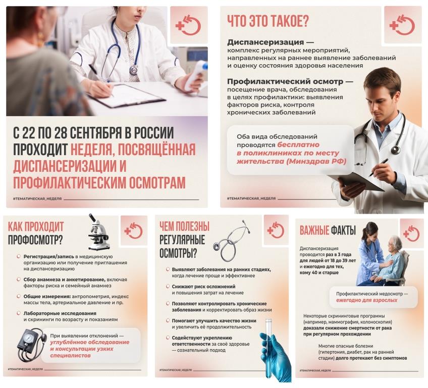С 22 по 28 сентября проходит Неделя, посвящённая диспансеризации и профилактическим осмотрам. Такие проверки позволяют заметить болезни на ранней стадии и предупредить осложнения.